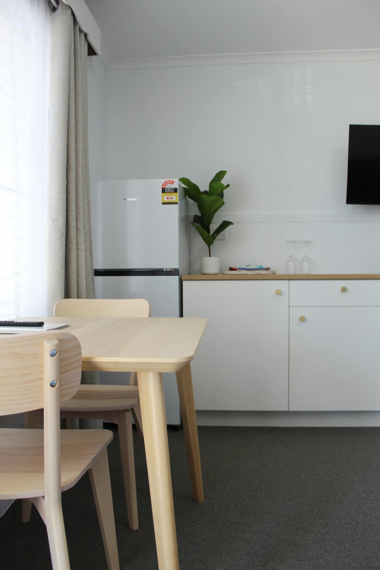 The room features one queen bed, one single bed, ensuite and kitchenette, equipped with;